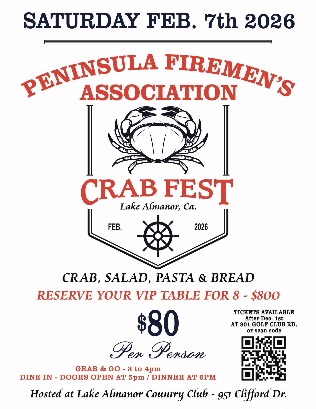 Peninsula Fireman Fund crab fest will be Feb 7th. Get you tickets before they are sold out.