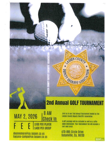 Join the Lassen County Deputy Sheriffs’ Association for the 2nd Annual Golf Tournament.  May 2, check in at 8am at the Diamond Mountain Golf Course. Your tournament fee will include a cart and lunch.  Contact [email protected] or [email protected]. Get your tickets today.