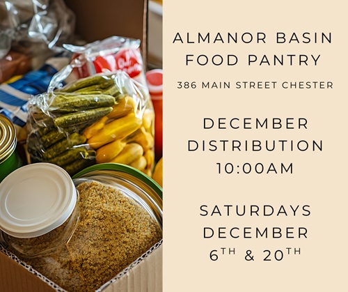 December food distribution will be on December 20th at 10am. 386 Main Street in Chester.