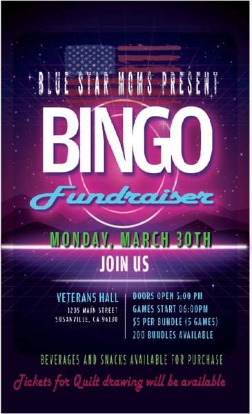 Monday, March 30th Blue Star Moms Bingo. This is a fundraiser for Blue Star Moms. Doors open at 5pm, games start at 6pm. Beverages and snacks available. Tickets for Quilt drawing will be available. All the fun is at the Veteran Hall in Susanville