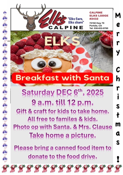 The Calpine Lodge is happy to announce that Dec 6, 2025 from 9 am till 12 pm it will have Breakfast with Santa. Children, ages birth thru 12 years and their parents / caregiver, are welcome. Please bring a canned food item for donation to the Lodges holiday food drive. Membership in the Elks is lifelong and cherished. “Elks CARE Elks SHARE” Calpine Elks Lodge is located at 72192 Hwy 70, Portola, CA.