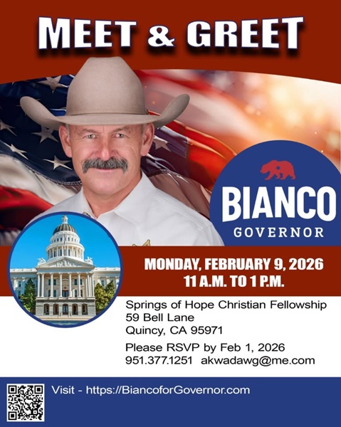 Chad Bianco for Governor meet and greet will be on February 9th from 11a to 1pm at the Springs of Hope Christian Fellowship in Quincy. Come on down and meet California Governor 2026 Candidate Chad Bianco! Vote for a safer, stronger California by voting for Riverside County Sheriff Chad Bianco in the 2026 election for California Governor.