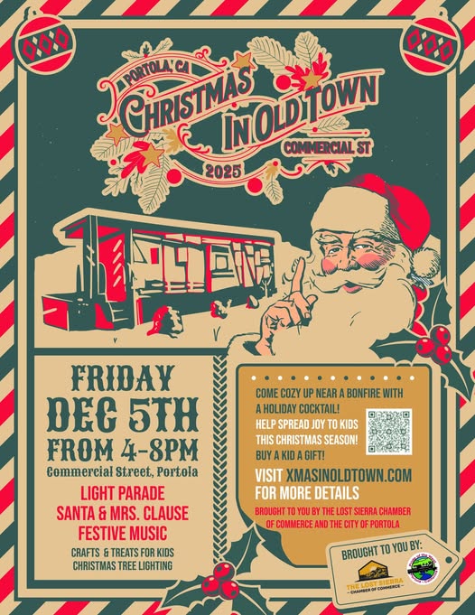 Christmas in Old Town is taking place on Friday, December 5th from 4-8pm on Commercial Street in Portola.