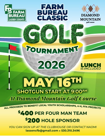 This will be at the Diamond Mountain Golf Course with lunch included. Sign up at the clubhouse or [email protected] or call 530-310-3496
