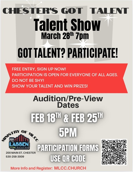 Got Talent, don’t be shy. The talent show is March 28 but we are holding Auditions on Feb. 18th & 25th. For more information and to register: MLCC.CHURCH