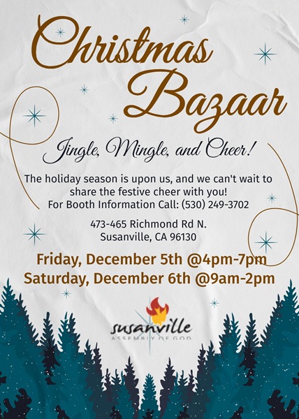 Friday & Saturday, December 5 & 6 Christmas Bazaar Jingle, Mingle, and Cheer. The holiday season is upon us and we can’t wait to share the festive cheer with you. Susanville Assembly of God Church, 473-465 Richmond Rd, N. Susanville. Friday 4pm – 7pm and Saturday 8am – 2pm