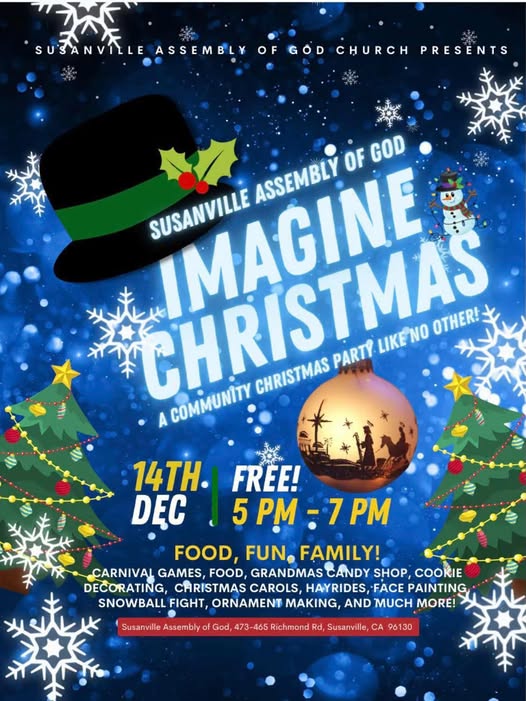 Susanville Assembly of God presents Image Christmas, a community Christmas party like no other. This is a free event from 5pm to 7pm. Food, family fun, carnival games, Grandmas Candy shop, Cookie decorating, Christmas carols, Hayrides, Face Painting just to mention a some of the events.
