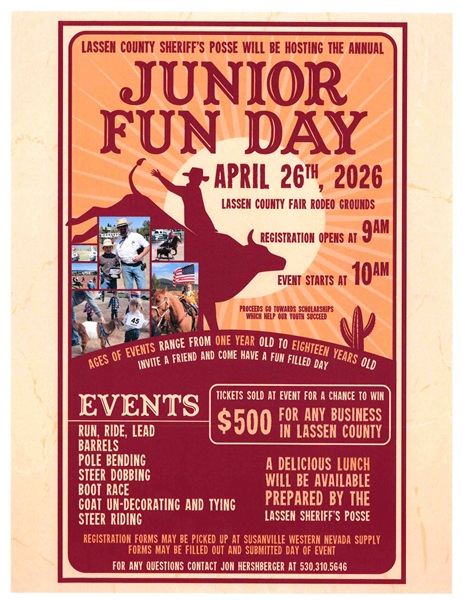 Lassen County Sheriff’s Posse will be hosting the Annual Junior Fun Day at the Lassen County Fair Rodeo Grounds. Events, run, ride, lead, barrels, pole bending, steer dobbing, boot race, goat un decorating and tying, steer riding. AND this year, Mutton Bustin is back for kids that are 4 -7 yrs and under 55 pounds.. All proceed go to scholarships. Registration is at 9am. Tickets are sold at the radio station for a chance to win a $500 gift certificate for any business in Lassen County.