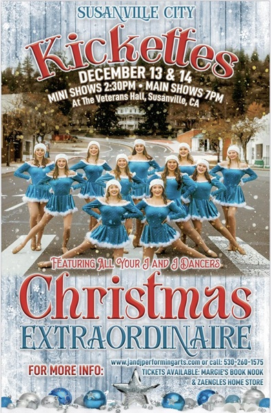 Susanville City Kickettes will be performing a the Veteran Hall in Susanville on Dec. 13 & 14th Mini Show at 2:30pm with he main show at 7pm. Get your tickets at Margies Book Nook or Zaengles Home Store.