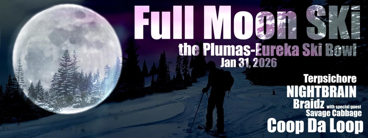 WildBio Flourishing reports that full moon ski events are returning this winter to the Johnsville Historic Ski Bowl at Plumas-Eureka State Park. These events offer a unique evening experience that combines uphill skiing, snowshoeing, art and live music under the light of the full moon. The event is hosted by WildBio Flourishing and the Plumas Ski Club in partnership with Adventure Monkeys, Vibecraft Productions and California State Parks.