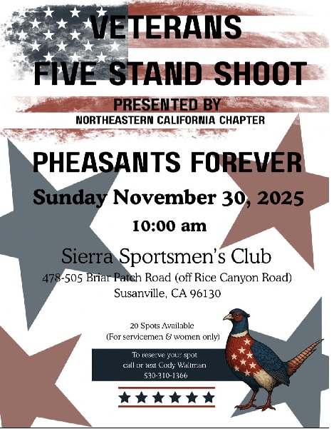 Pheasants Forever Veterans Five Stand Shoot will be at 10am on November 30th at the Sierra Sportsmen’s Club (Rice Canyon Road). Only 20 spots available for servicemen and women only.