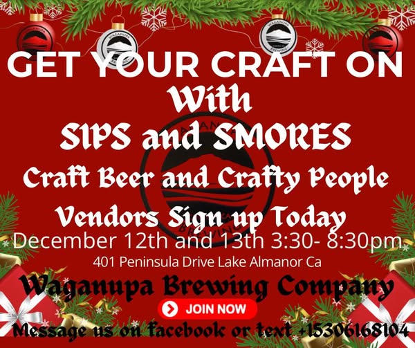 Friday & Saturday December 12 & 13 Sips and Smores Christmas Shopping at Waganupa December 12 and 13th 3:30-8:30pm Get your craft on with Sip and Smores, craft beer and crafty people. 401 Peninsula Drive, Lake Almanor