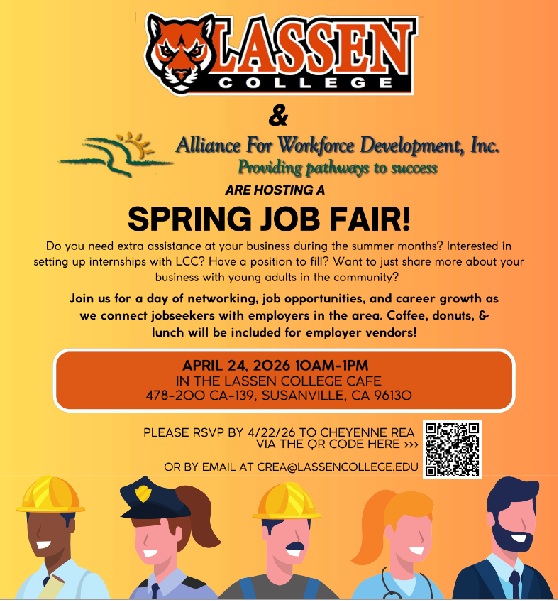 Do you need extra assistance at your business during the summer months? Interested in setting up internships with LCC? Have a position to fill? Want to just share more about your business with young adults in the community? Join us for a day ft networking, job opportunities, and career growth as we connect job seekers with employers in the area. . April 24th form 10 – 1pm in the Lassen College Café.