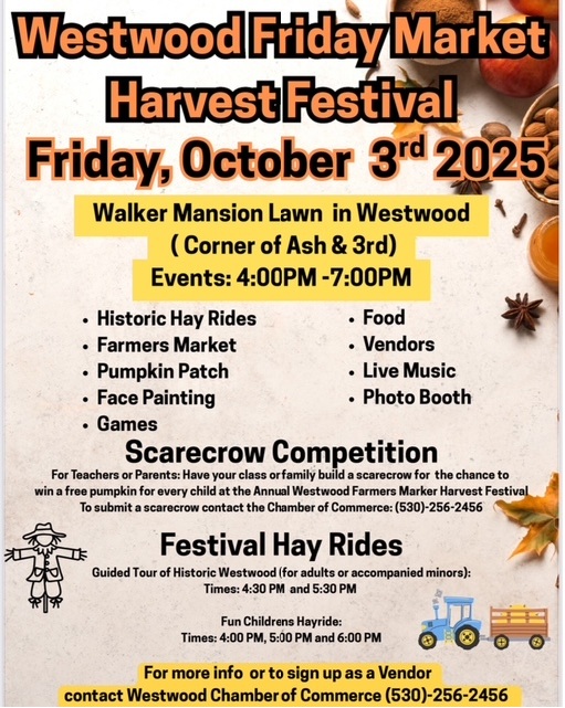 Westwood Friday Market Harvest Festival, Friday, October 3rsd at the Walker Mansion Lawn in Westwood. The event is from 4pm to 7pm. Bring the kids, Hay Rids, Farmers Market, Pumpkin Patch, Face Painting, games, and of course food! Live music and lots of vendors. There will be a scarecrow competition. For more information or to sign up as a vendor contact the Westwood Chamber of Commerce.