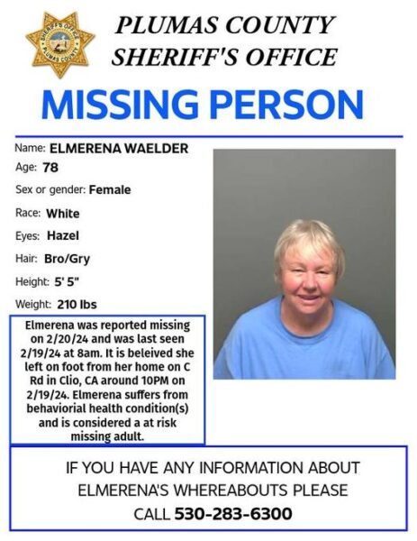 If you have any information on Elmerena’s whereabouts, you are urged to contact the Plumas County Sheriff’s Office at 530-283-6300.