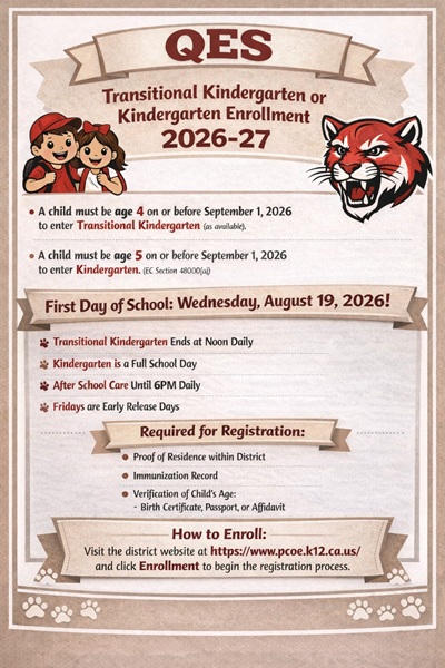 Quincy Elementary is excited to begin enrollment for incoming Transitional Kindergarten (TK) and Kindergarten students for the 2026–27 school year!