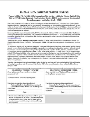 The Plumas County Local Agency Formation Commission unanimously approved annexing the Chester district to Peninsula Fire when it met Dec. 27. The timing is designed to allow Peninsula Fire to collect taxes from Chester Fire district residents in 2025, said Plumas County Supervisor Kevin Goss, who serves as chair of the LAFCo board.