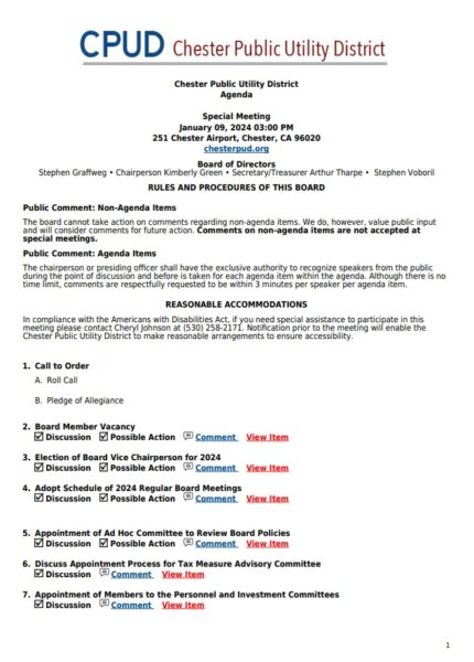 HomeLocalChester Public Utility District Board Agenda for Tuesday January 9th, 2024Chester Public Utility District Board Agenda for Tuesday January 9th, 2024Mon, January 8, 2024SHARE NOW ×❮❯