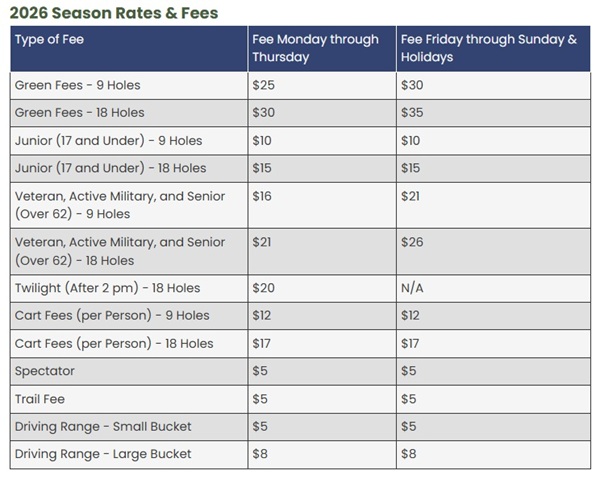 The 2026 Season is here! Download the 2026 Membership Form (PDF) and deliver to the Finance Department located at City Hall or payments can be made at the golf course.