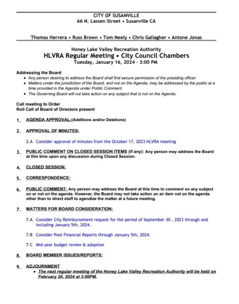 HomeLocalHoney Lake Valley Recreational Authority AgendaHoney Lake Valley Recreational Authority AgendaMon, January 15, 2024SHARE NOW An interactive link to the agenda can be found at CityofSusanville.net×❮❯