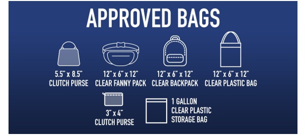 - Bags being labeled a “diaper bag” must be paired with a guardian and child, upon entry and contain diaper-changing related items, such as diapers, wipes, childcare needs, etc. Diaper bags are not subject to the 12”x6”x12” sizing, but will be screened prior to entry.