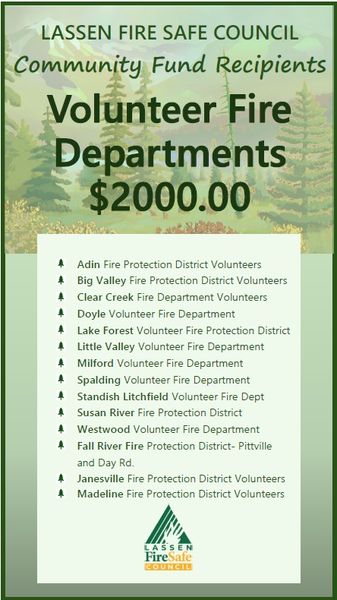 Volunteer fire departments serving Lassen have been identified as the primary beneficiaries in the inaugural round of funding. $2,000 checks will be disbursed to 14 Fire Protection Districts and Volunteer Fire Departments across Big Valley, Adin, Doyle, Stnadish, Milford, and Westwood.