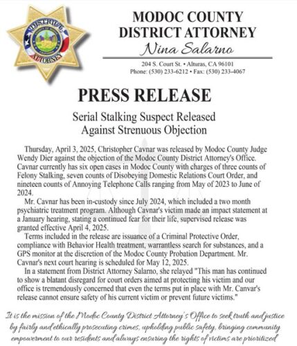 HomeLocalModoc County DA Serial Stalking Suspect Release against ObjectionsModoc County DA Serial Stalking Suspect Release against ObjectionsFri, April 4, 2025SHARE NOW Modoc County District Attorney released the following statement.