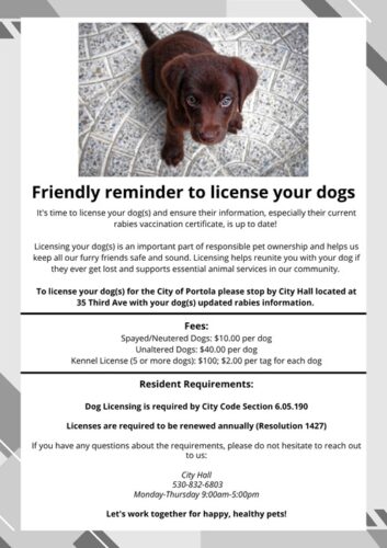 The City of Portola is reminding city residents that your dog is required to be licensed per City Code Section 6.05.190. Dog licenses are required to be renewed annually.
