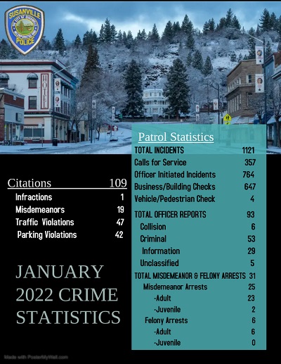 HomeLocalSusanville Police Department January Crime StatsSusanville Police Department January Crime StatsWed, February 16, 2022SHARE NOW ×❮❯