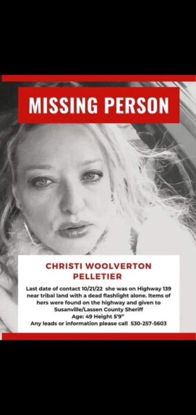 Christen Pelletier has been missing since October 21, 2022, from the Susanville area. She was last seen on Highway 139 in the vicinity of Willow Creek Valley.