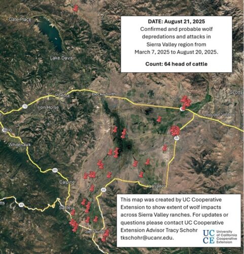 This map provides an illustration of confirmed and probable wolf depredations and attacks in the Sierra Valley region between March 7, 2025 and August 20, 2025.