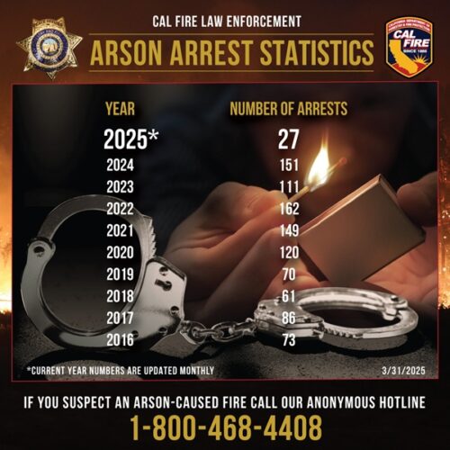 Cal Fire released the Arson numbers for March. Through March 2025, CAL FIRE law enforcement personnel have made 27 arson arrests. Help bring those who set intentional fires to justice by reporting them anonymously through our arson hotline at 1-800-468-4408.
